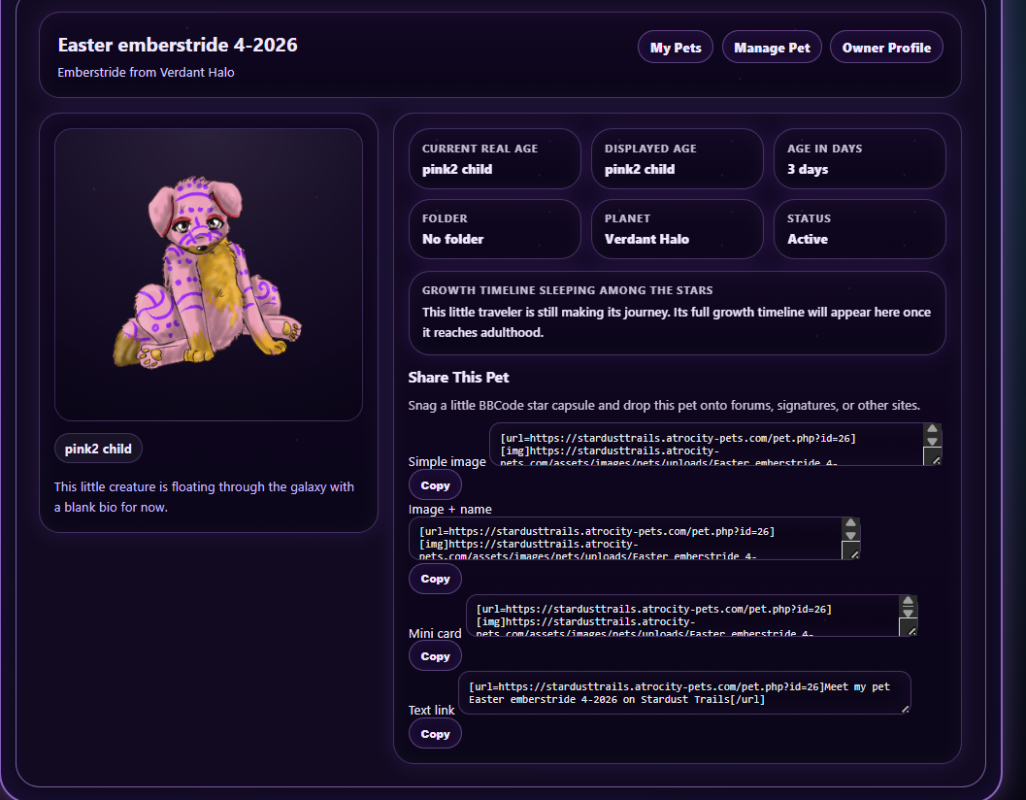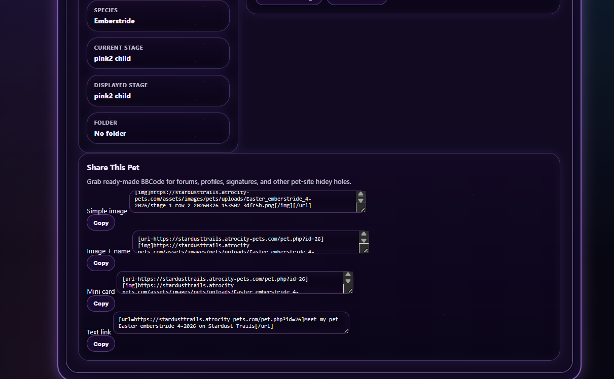 --Added bbcodes to the pet pages so you can share your babies everywhere you want to!